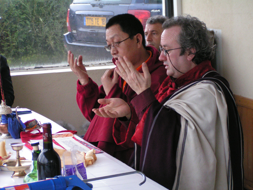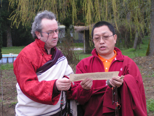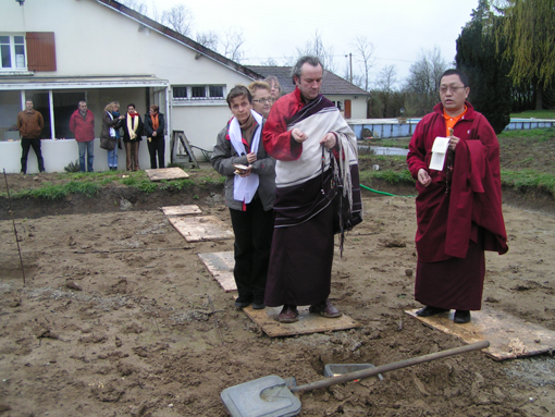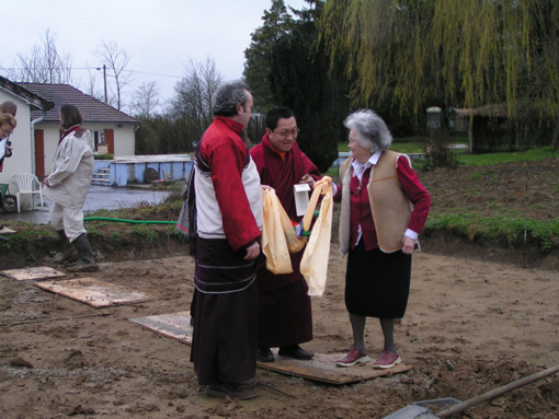 Lama Seunam nous a fait l'honneur d'accepter notre invitation pour la consécration des fondations des deux futurs bâtiments. Durant la cérémonie du Sèr Kyim nous avons disposer un vase consacré au centre de la fondation.