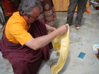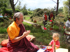 Durant la cérémonie, Lama Shérab a disposé un vase consacré au centre de la fondation stoupa